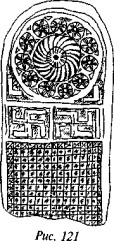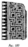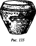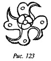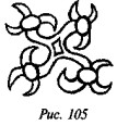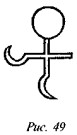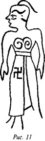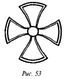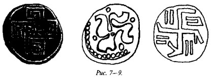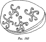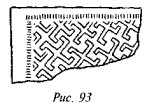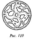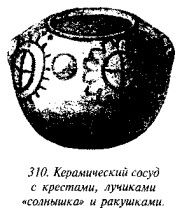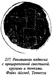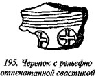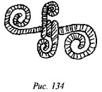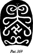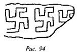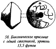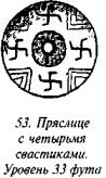 На рис. 50 мы видим одно из биконических пряслиц, две стороны которого украшены различными геометрическими фигурами, причём вытянутые в длину линии перемежаются с точками, дуги концентрических кругов расположены «радугами» по три и пр. На одной из сторон этого древнего предмета ясно видна классическая свастика, ветви которой пересекаются под прямыми углами, а концы заламываются под прямыми углами в правом направлении.