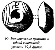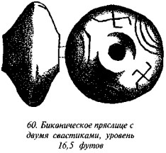 Первый и второй слои. Здесь найдено совсем немного пряслиц, и ни на одном из них не было знака свастики — тогда как в слоях с третьего по пятый они были обнаружены тысячами, и многие из них с интересующей нас эмблемой. Пряслица первого слоя практически все не декорированы, однотипной чёрной глазурованной окраски, конусообразной формы (как на рис. 55), либо в виде двух конусов, соединённых между собою основаниями (как на рис. 52). Обе разновидности попадались на глубинах 33 фута и глубже. Другие пряслица с того же холма были украшены насечками, в которые был втёрт обычный белый мел, так что в результате получилась плоская поверхность. Во втором слое пряслица были меньше по размеру, исключительно чёрного цвета, а их нарезной декор практически не отличался от пряслиц из позднейших слоёв существования этого древнего города.