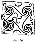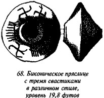Образчик с рис. 65 имеет три сегмента с тремя же параллельными линиями; оставлен недекорированным лишь центр, где и расположено отверстие (сравни рис. 60 и 64). Между двумя секторами вписана свастика необычной формы, главные ветви которой пересекаются под прямыми углами, но четыре их конца представляют различные стили декорировки — два заломаны под прямыми углами налево, один под прямым углом направо, а четвёртый загибается налево, не образуя никакого угла. На рис. 66 изображено биконическое пряслице, верхняя часть которого представляет три свастики и три «пылающих алтаря». Все свастики левозакрученные, отростки их в ряде случаев загибаются под прямыми углами, в других — под тупыми углами, причём два или три из них «прищипаны»; на двух из них сохранились следы поправок, когда рядом с отростком, процарапанным под одним углом, добавлялся другой, направленный под «правильным» углом, или прямой отросток правился на изогнутый.