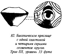 Троя III — сожжённый город (глубина 23–33 фута). — Пряслице на рис. 43 имеет две свастики и два креста. У однойсвастики две ветки загнуты под прямыми углами направо, тогда как другие две загнуты направо, но с округлыми загибами. Другая свастика имеет два загиба, один с заломом под прямым углом, другой — с округлым загибом. Образец с рис. 44 имеет две свастики, одна из которых с четырьмя ветвями, заломленными под прямыми углами в левом направлении. Эмблема прочерчена двойными линиями, одна потолще, а другая потоньше, словно бы представляя собою тень от толстой линии. Вторая свастика имеет тупозагнутые в левом направлении углы с равными по длине ветвями. Пряслице с рис. 45 почти шарообразное, в верхней части его процарапаны две свастики. Оконечности всех четырёх ветвей загнуты под прямыми углами, у одной свастики направо, у другой налево. На рис. 46 изображено пряслице с двумя неправильными ломаными свастиками, но одна ветвь согнута под прямым углом, а все прочие ветви и отростки расположены вперемешку — более того, они неравны друг другу по длине. Соседнее пространство занято неопределёнными значками, из которых какой-то смысл могли бы иметь лишь точки (или углубления), которых всего семь.