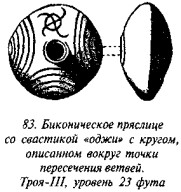 На рис. 57 мы показываем еще одно конусообразное пряслице, на плоской поверхности которого нарисована одна настоящая свастика, две ветви которой пересекают друг друга под прямыми углами, а два отростка заломаны также под прямыми углами в правом направлении, два других в равной степени загнуты направо, но они не загнуты, а закруглены. Доктор Шлиман применяет термин «свастика» к еще двум фигуркам, хотя относительно расположения их ветвей и отростков трудно сказать что-либо определённое. Четвёртая фигурка кажется неудачно нарисованной либо испорченной свастикой. На рис. 58 мы видим биконическое пряслице, испещрённое странными и необъяснимыми символами. Один из них похож на грубую свастику, у которой главные ветви пересекаются под прямым углом, а ломаные отростки загнуты под различными углами, три налево, а четвёртый направо. Эти знаки столь примитивны и грубы, что представляется сомнительным, придавал ли наносивший их какое-либо им значение, орнаментальное или символическое. Пряслице с рис. 59 почти коническое, уплощённая поверхность его лишь слегка приподнимается к центру. Оно практически той же формы, что и пряслица с рисунков 55 и 71. Верхняя поверхность почти уплощённая, а на ней, на равном удалении от срединного отверстия и друг от друга, расположены три свастики «оджи», выписанные двойными линиями, концы которых загнуты вправо. Фон свастикам составляют небольшие концентрические нарезные окружности, с точками в центре.