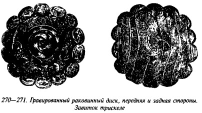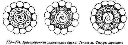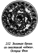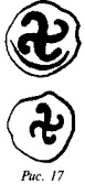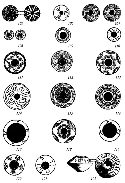 На рис. 62 нарисованы три свастики, прорисованные двойными параллельными линиями, отростки одной загнуты под практически прямыми углами, причём одна является правозакрученной, а другая — сочетает в себе черты право- и левозакрученной фигуры. На рис. 63 показано очередное пряслице с чашкообразным углублением вокруг срединного отверстия, которое описано тремя концентрическими окружностями, а на оставшемся свободным поле нарисованы четыре левозакрученные свастики «оджи» (тетраскеле), заканчивающиеся спиралями. Пряслице с рис. 64 биконическое, причём, как обычно, верхний конус меньших размеров. Три серии параллельных концентрических круговых линий делят поверхность артефакта на сектора, в одном из которых процарапана фигура, внешне схожая со свастикой довольно редкого и примечательного начертания, напоминающая образец, показанный на рис. 60. Две главные ветви пересекаются под правильным прямым углом, а отростки, заломанные также под прямыми углами, нагибаются друг к другу таким образом, что если бы они сомкнулись, то образовали бы восьмёрку с ломаными окружностями.