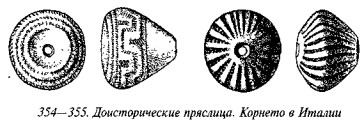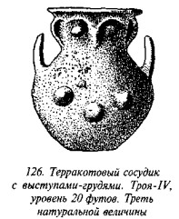Уровень Троя V. — Сам Шлиман пишет («Ilios», с. 573): «Грубые каменные молотки, найденные в большом количестве в четвёртом горизонте, пропадают из пятого уровня, равно как и каменные топоры, бывшие прежде столь многочисленными. Вместо сотен топоров, собранных в четвёртом слое, в пятом я нашел всего два. Формы терракотовых пряслиц здесь также почти полностью изменились. Эти предметы сделались намного грубее и безыскуснее, стали удлинёнными, а их оконечности — заострёнными. Типы пряслиц, изображенные на рис. 1801—3 [рис. 72–74 настоящей книги] становятся здесь наиболее частыми».