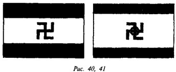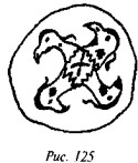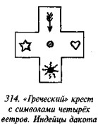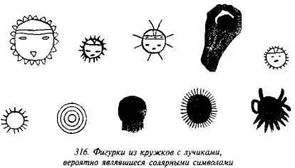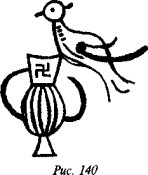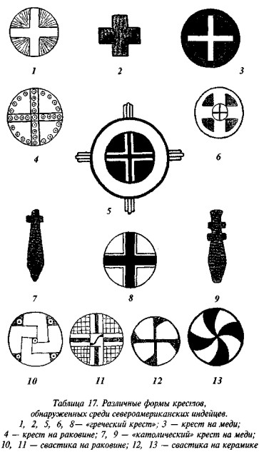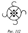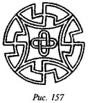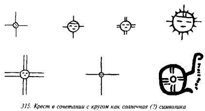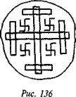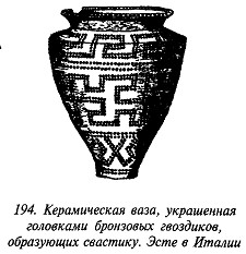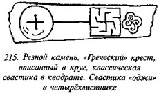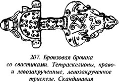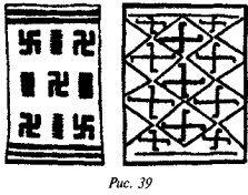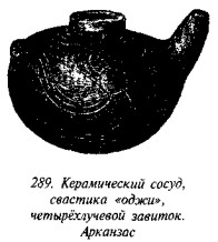 что в русской традиции свастика, «вращающаяся» посолонь, служит добрым знаком, в обратном же направлении — недобрым, предполагая, что две свастики некогда символизировали два полугодовых состояния солнца (по-нашему, это чересчур натянуто). В качестве примеров пар свастик он приводит рис. 182 (Малая Азия, II тыс. до н. э.), рис. 183 (этруски) и рис. 184 (доколумбова Америка).