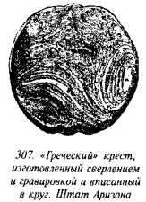 На рис. 67 мы видим четыре образчика свастики, главные ветви которой пересекаются под прямыми углами. Отростки загнуты вправо, почти под прямыми углами, и слегка «прищипнуты», образуя аналог свастики джайнов (рис. 34с). Они перемежаются фигурой «горка» (chevron decoration)24. Одна из свастик скомпонована из двух гнутых линий («крест оджи»), две ветви еще одной закруглены, тогда как остальные заломаны под прямыми углами, некоторые из них пригнуты к центру, образуя нечто в виде «расцветших оконечностей» (рис. 67 и 34с). Одна из этих оконечностей, подобно тому, что мы видим на рис. 66, была подправлена изготовителем артефакта. На рис. 69 изображена свастика, главные ветви которой пересекаются почти под прямыми углами. Оба конца одной ветви загнуты направо, а другой — налево, образуя нечто вроде восьмёрки. Одна из оконечностей закруглена, другие загнуты под различными углами. На рис. 70 мы можем видеть параллельные линии, представляющие сегменты круга, схожего с тем, что мы имеем на рис. 60, 64, 65 и 69, с той разницею, что здесь их четыре, а не три. На пряслице нацарапана одна свастика, главные ветви (прочерченные параллельными линиями) пересекаются под прямыми углами, оконечности закругляются налево, образуя подобие «креста оджи».
