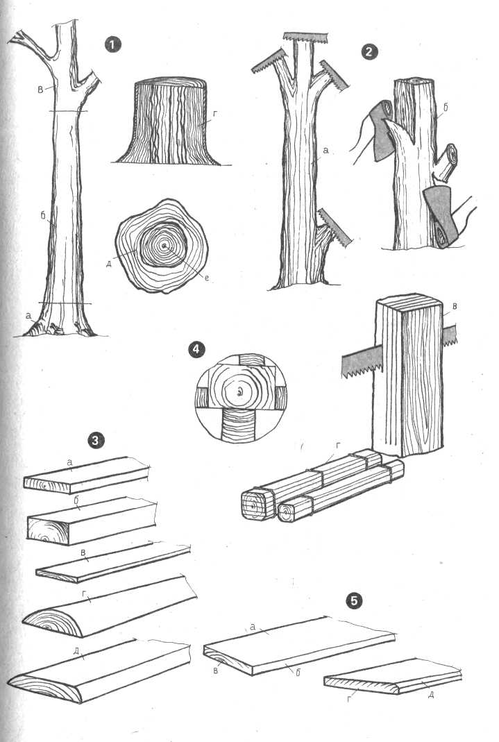 1 — раскрой дерева: а — комель; б — ствол;, в — вершина; г — свиль, д — заболонь; е — ядро; 2 — заготовка сучковатых обрезков стволов и толстых суков: а — общий вид заготовки; б — прием отесывания подсохшего стволика; в — распиливание заготовки на дощечки с непропилом, по торцу; г — хранение распиленных заготовок в связке; 3 — вицы пиломатериалов: а — доска; б — брус; в — тес; г — горбыль; д — подгорбыльная доска с обзолом по кромкам; 4 — раскрой шпалы из кругляка (заштрихованным показаны участки для заготовок столярного материала); 5 — наименование частей доски: а — пласть; б — кромка; в — торец; г — полуторец; д — фаска