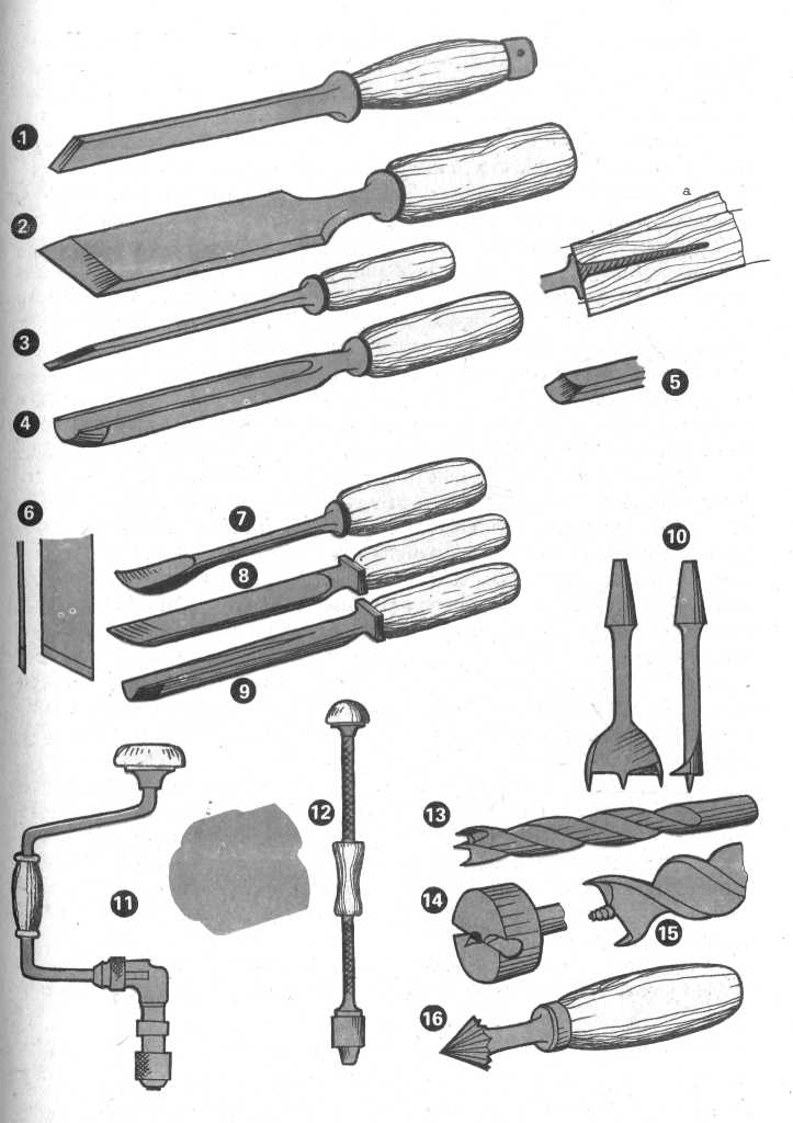 1 — долото; 2 — стамеска широкая кованая: а — вставка хвоста в заготовку штылька; 3 — стамеска узкая; 4 — стамеска полукруглая с внешней фаской; 5 — то же, с внутренней фаской; 6 — плоская резчицкая стамеска; 7 — клюкарза; 8 — скругленная резчицкая стамеска; 9 — уголковая стамеска; 10 — перка; 11 — коловорот; 12 — дрель винтовая ручная; 13 — спиральное сверло по дереву; 14 — пробочное сверло (головка); 15 — спиральный бурав; 16 — зенковка