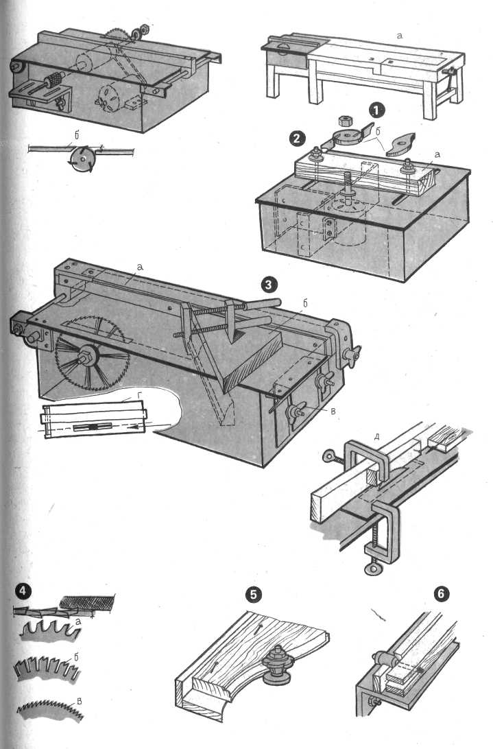 1 — универсальный станок с ножевым пильным валиком и фрезерным патроном: а — станок встроен в верстак; б — подъем зарезцовой части стола рубанка; 2 — фрезерный настольный станок: а — переставной упор; б — шарошки; 3 — настольный круглопильный станок: а — подвижный упор; 6 — скользящий упор для усовых запилов; в — подъемное устройство для стола; г — рассвет упорного бруска при распиловке; д — приспособление для точного пиления тонких деталей; 4 — формы зубьев круглых пил: а — для продольного пиления с разводом зубьев; б — заточка зубьев металлорежущей фрезы; в — для «бархатного» пиления (применяется и для пиления металла); 5 — обработка кривых кромок на фрезерном станке с помощью шаблона; 6 — обработка проушин и шипов с помощью сверла на фрезерном столике универсального станка