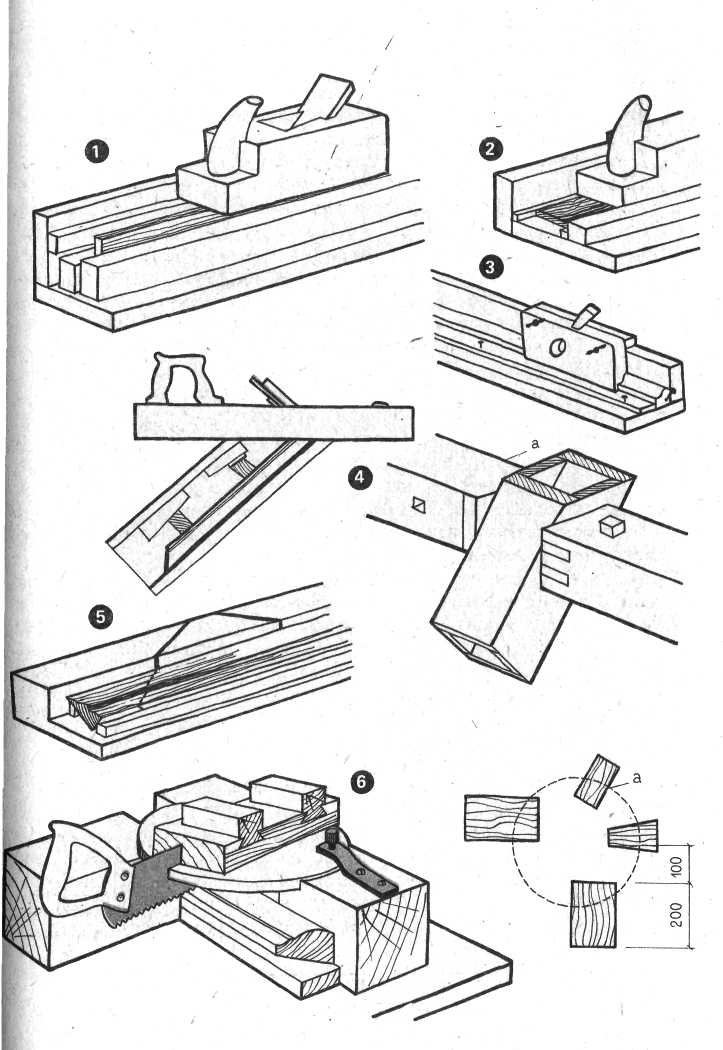 1 — уголок строгания ребер линеек; 2 — то же, для строгания пласти; 3 — то же, для профильного строгания; 4 — коробовое стусло для застрожки усов; 5 — уголковое стусло для запиливания усов; б — поворотное стусло для разноугольной запиловки: а — схема размещения опорных бобышек стусла