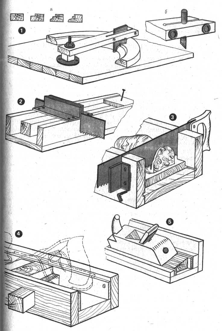 1 — щитовой столик с воротком для вырезания круговых деталей и профилей: а — порядок обработки профиля; б — крепление ножа в воротке; 2 — стусло для торцевого резания брусков; 3 — стусло для резки каповых дощечек; 4 — стусло для торцевания кубиков; 5 — уголок для застрагивания фасок