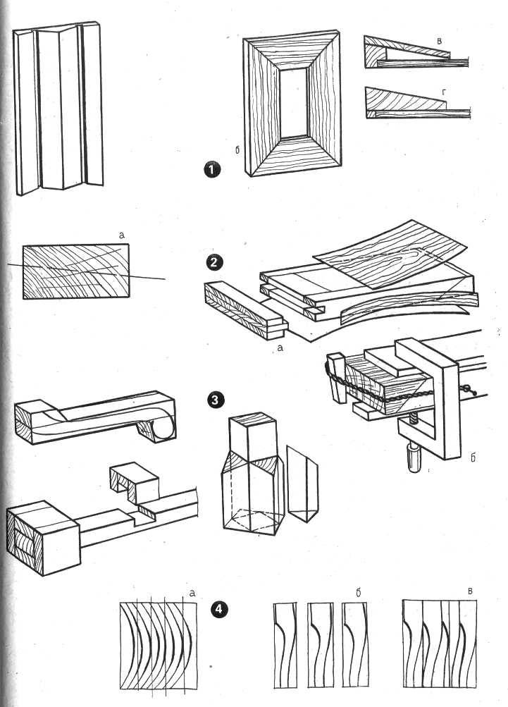 1 — накладной рельеф из клиньев: а — получение клина из бруска; б — массивное обрамление щитка; в, г — приемы формирования массива; 2 — устройство торцовых вклеек в щит или доску мягкой породы с последующей облицовкой пласти: а — склеенный торец; б — прием обжатия торца при склеивании; 3 — подклеивание бобышек для резных деталей мебели; 4 — увеличение выхода массивных деталей из щитов-склеек по сравнению с рассыпной заготовкой: а — круглой отбоптовки; б, в — фигурных ножек