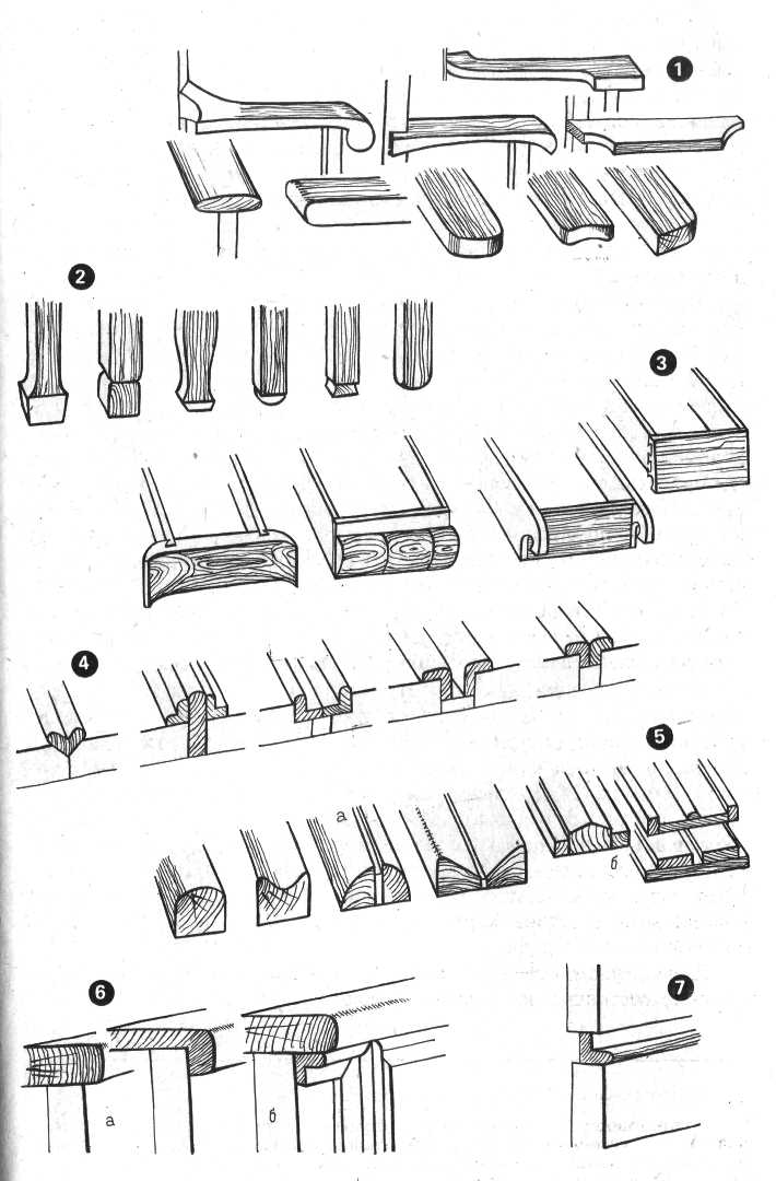 1 — столярные профили: а — гусек; б — каблучок; в — выкружка; г — четвертной валик; д — полувалик; е — полочка; ж — двойная полочка (уголок); з — сложный (составной) профиль; 2 — накладные орнаменты из профилированных реек; 3 — декоративные возможности использования срезков и линеек: а — орнаментировка плоскости срезками линеек; б — то же, косыми срезками брусков; 4 — места разметки центров при использовании циркулярных деталей; 5 — орнаментировка фасонными кусками дерева: а — розетка на плоскости; б — дверка с широким обрамлением и декоративным центром; в — орнаментировка вставными бантиками