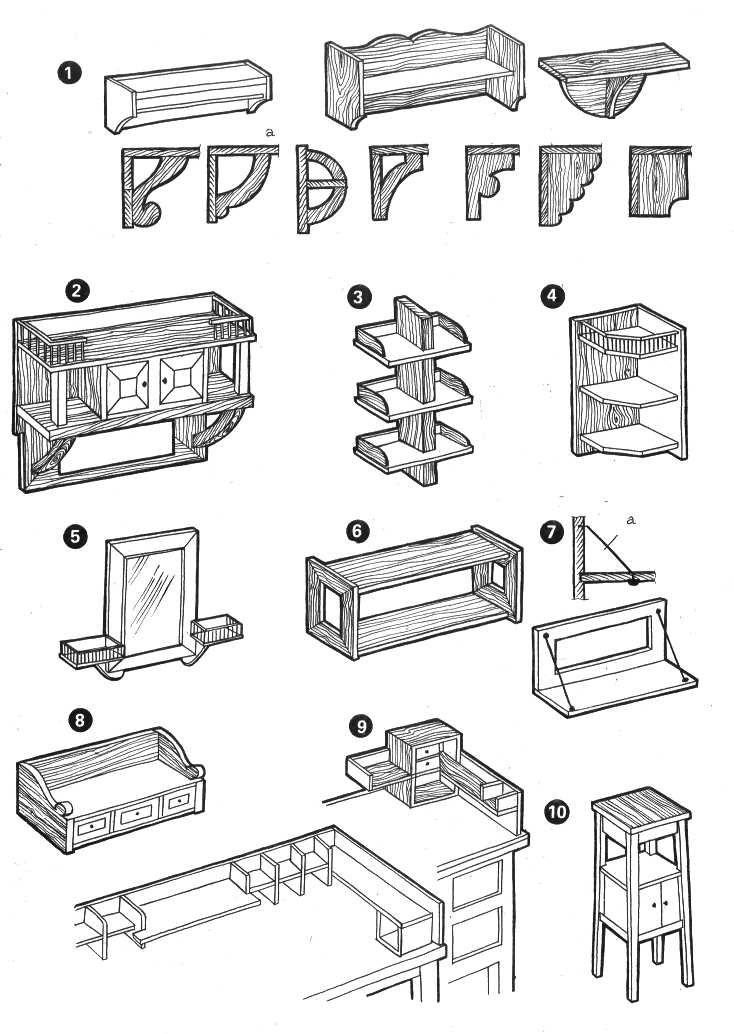 1 — навесные полки с щеками и консолями: а — примеры форм консолей; 2 — полка со шкафчиком; 3 — полка ребровая консольная; 4 — полка угловая; 5 — полка с зеркалом; 6 — полка на несущих рамках; 7 — полка на металлических подвесках: а — вид сбоку; 8 — полка с нижними ящиками; 9 — полки настольные; 10 — полка-тумбочка