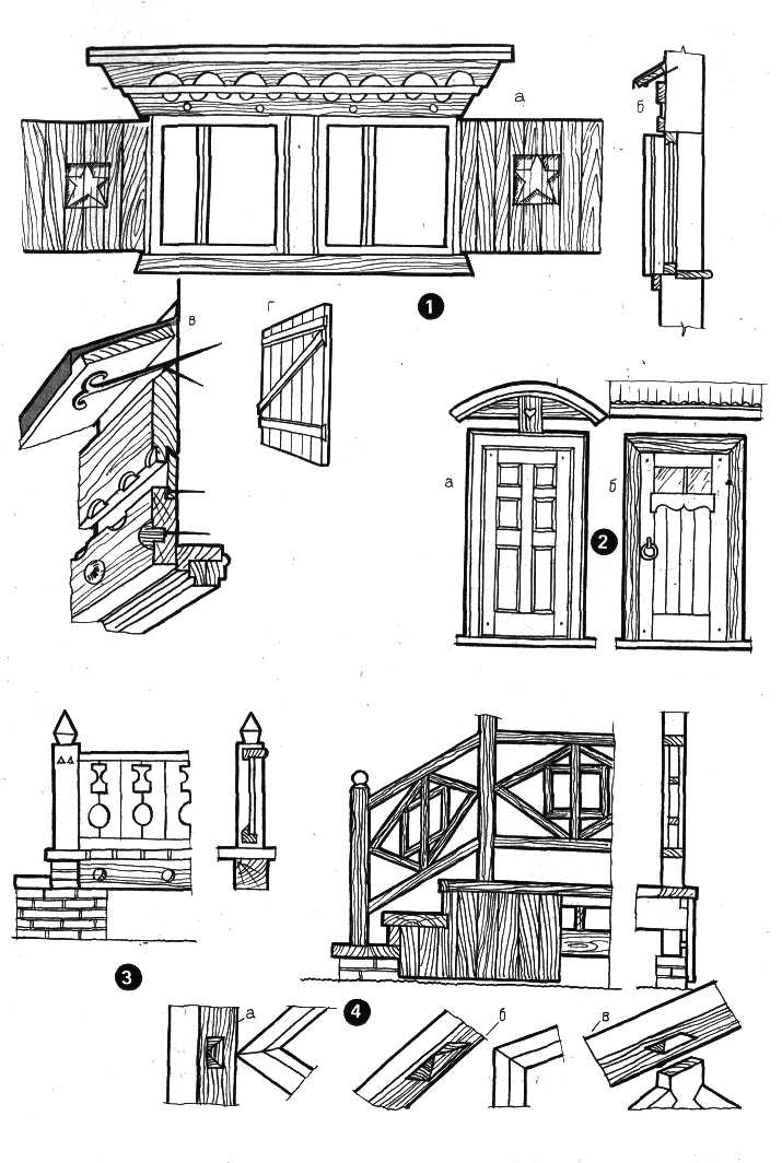 1 — наличник на двойное окно: а — общий вид; б — разрез; в — детальное устройство верха наличника; г — вид ставни с обратной стороны (крепление на шпонках); 2 — входные двери: а — филенчатая дверь с наличником и навершием столярной работы; б — дверь народного характера с остекленным верхом под навесом; 3 — крыльцо с дощатым ограждением для маленького домика; 4 — крыльцо с решетчатым ограждением: а-в — примеры соединения деталей решетки