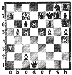 Итак, король белых остался один на доске против черного воинства: короля, ферзя, ладьи, слона и двух коней! По рассказу слепого грека, царю светлых предстоит целых восемь ходов быть в поле одному, вооруженному лишь «стрелами» (пешками!), и не только выстоять, но победить противника!
