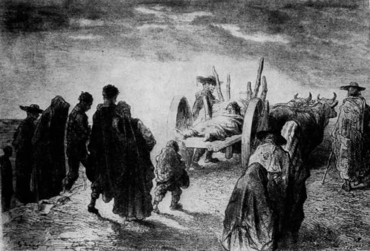 Присмотримся к жизни этих Хуанов и Диэго из деревенской глуши. Того, что останется им после уплаты сеньоральных повинностей и налогов государству, еле хватит на полуголодную жизнь, как ни бейся над своей полосой. Зачем же проливать пот, зачем весь век гнуть спину? В праздники деревенский труженик подолгу выстаивает в храме. Церковь не пожалела ни золота, ни самоцветов, ни дорогих тканей, чтобы поразить воображение и пленить душу своего убогого, задавленного нуждою сына. В его лачуге голо, темно, а здесь жарко горят свечи и в их сиянии мерцают, переливаются ризы на иконах и одежды статуй. В неверном свете восковых свечей статуи как будто живут мистической жизнью. Нежно улыбающаяся мадонна может поспорить пышностью одежд с самой королевой. Один венец на ее главе стоит труда десяти деревенских поколений. Кончается служба, положенный крестный ход, и крестьянин бредет к себе домой. Сурова улица кастильской деревни. Кругом ни деревца, ни цветка. Стены домов сложены из грубого, не связанного известкой камня. На улицу глядит маленькое окошко за железным переплетом. Тяжелая, на крепком железном засове дверь… В доме ни кровати, ни стола. Спят вповалку, не раздеваясь, на устланном сеном полу. Едят у очага, присевши на корточки или поджав под себя ноги, из общей миски. Знатные путешественники — англичане, французы, посещавшие Испанию в конце XVIII века, — не могли надивиться воздержности испанцев в еде и питье. Пригоршня жареных каштанов, запиваемых водой, ломоть грубого хлеба, немного луку, гороху. В праздник — суп из овощей, заправленный оливковым маслом, да глоток вина, вот и вся пища. Но вековая нищета не лишила испанца чувства своей человеческой значимости, не сломила его внутренней стойкости. Испанец из народа поражал иностранца-путешественника. Завернут по самые глаза в ветхий плащ, голова повязана цветной тряпкой, поверх нее нахлобучена широкополая, потерявшая цвет и форму шляпа. К босым ногам веревкой прикреплены подошвы. И поди же! — этот бедняк не раболепствует перед расшитым кафтаном, держится непринужденно, умеет в гордой, несколько надменной позе, в полном достоинства поклоне, в свободной речи показать себя равным. Часами сидит испанец неподвижно на пороге своего жилища или стоит, прислонившись к стене. По лицу его бродят сумрачные тени. Может показаться, что это самое угрюмое и бесстрастное существо в мире. Но надо видеть народные увеселения, чтобы понять, какой живостью, какой бурной страстностью наделена нация. В деревне по вечерам у посады[9] собираются в круг стар и млад. Под гитару и кастаньеты пляшет молодежь. Остальные смотрят на пляску серьезно и сосредоточенно. Танец не забава, это исполненное значения действо. Парень выступает, гордо избоченясь, закинув голову. Он — сама Кастилия, суровая и воинственная. А вокруг него вьется и протягивает руки, манит и отступает девушка.