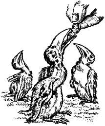 Еще один пример яркой индивидуальности – наша корнуоллская клушица Дингл. Черное оперение этого своеобразного представителя вороновых сочетается с красными ногами и длинным, немного изогнутым ярко-красным клювом. Выкормленный людьми, Дингл был совсем ручной, и первые дни мы держали его у себя в квартире. Но после того как он разбил восьмой стакан, я решил, что лучше выдворить его в открытый вольер.Милейшее существо на свете, Дингл больше всего любил, когда ему чесали голову. Припадет к земле или к вашим коленям, зажмурится, крылья дрожат от наслаждения…Ему нравилось также сидеть на плече Джеки и тихонько перебирать клювом ее волосы, как бы отыскивая букашек. А однажды, сидя на моем плече, он улучил минуту, когда я отвлекся, и засунул мне в ухо клочок бумаги, да так глубоко, что его пришлось извлекать пинцетом. Не иначе, вообразил, будто мастерит гнездо.Переселение в вольер нисколько не ожесточило Дингла, он охотно спускается поговорить с вами и подставляет голову, чтобы вы могли ее почесать.Вообще пернатых любителей поговорить у нас хватает. Когда гасят свет на ночь, попугай Суку говорит сам себе: «Спокойной ночи, Суку». А горная майна Али явственно произносит: «Где Триггер?» и «О-о-о, какой славный мальчуган!» Но, пожалуй, самый лучший оратор – майна более мелкого вида, по имени Тапенс. Подойдите к клетке Тапенса и попробуйте с ним заговорить. Он сразу рассмеется, а если вы просунете внутрь палец и погладите ему животик, зажмурит глаза и примется бормотать: «Ой, как здорово! Ой, как здорово!»Множество людей спрашивают меня,понимают ли говорящие птицы слова, которые произносят. Не берусь дать определенный ответ. Возьмите того же Тапенса. Вероятно, прежние владельцы, когда почесывали его, приговаривали: «Ой, как здорово!» – и он воспроизводит эти звуки, потому что они для него связаны с приятной процедурой. Впрочем, однажды Тапенс почти убедил меня в том, что говорит осмысленно.Подстригая кусты рядом с клеткой майны, наш престарелый и весьма уважаемый садовник мистер Холли вдруг прокашлялся и сплюнул на землю. Тотчас раздался отчетливый, звонкий голос Тапенса:– Старый неряха!Мистер Холли был страшно доволен и весь день посмеивался про себя.Про. попугаев рассказывают много историй, и большинство из них отнюдь не вызывает доверия. Но мне известны два случая, когда попугаи явно не ограничивались воспроизведением заученных звуков.У моих друзей, живших в Греции, был попугай; каждый день они выносили его клетку на воздух и ставили в тени под деревьями. Однажды местный крестьянин привязал за оградой своего осла, а тот, как это заведено у ослов, неожиданно вскинул голову и исполнил скорбное соло, завершив его обычным протяжным храпом. Попугай внимательно слушал, наклонив голову набок, и, когда осел кончил реветь, отчетливо произнес вопросительным тоном:– В чем дело, милый?Второй случай. Мои афинские друзья держали африканского серого попугая. Он знал довольно много слов – греческих, естественно, – и хозяева очень им гордились. У них было заведено раз в неделю устраивать «день открытых дверей», когда все их друзья могли зайти на чашку чая. В один из таких дней главной темой беседы был попугай и его лексика. Кто-то из гостей утверждал, что попугаи вообще не могут говорить, они лишь издают нечленораздельные звуки. Гордый владелец серого африкан