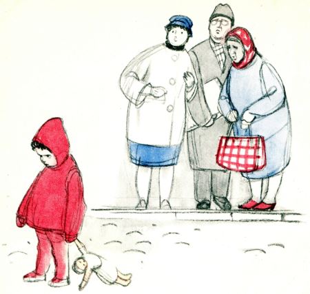 Во дворе уже гуляли: девочка в синем берете, девочка с куклой, мальчик-самолёт. Этот мальчик играл в самолёт. Он бегал по двору. Руки у него были крыльями. И он всё время гудел: „Ры-ры-ры…“ Как мотор. И ещё во дворе гулял мальчик. У него не было зуба. Переднего. Почему у него не было зуба? Кто знает? Потому что зуб у него выпал. А это совсем и не больно. Правда?