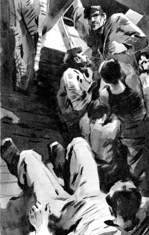 Эта схватка в темноте казалась столь ужасной, что я, весь дрожа, прислонился к трапу, не в силах сдвинуться с места. Я снова испытал знакомое сосущее ощущение под ложечкой, всегда появлявшееся у меня при виде физического насилия. Правда, в этот миг я ничего не мог видеть, но до меня долетали звуки ударов и глухой стук сталкивающихся тел. Койки трещали, слышно было тяжелое дыхание, короткие возгласы боли.