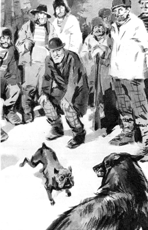 Красавчик Смит снял с него цепь и отступил назад. И впервые Белый Клык кинулся в бой не сразу. Он стоял как вкопанный, навострив уши, и с любопытством всматривался в странное существо, представшее перед ним. Он никогда не видел такой собаки. Тим Кинен подтолкнул бульдога вперед и сказал: – Взять его! Приземистый, неуклюжий пес проковылял на середину круга и, моргая глазами, остановился против Белого Клыка. Из толпы закричали: – Взять его, Чероки! Всыпь ему как следует! Взять, взять его! Но Чероки, видимо, не имел ни малейшей охоты драться. Он повернул голову, посмотрел на кричавших людей и добродушно завилял обрубком хвоста. Чероки не боялся Белого Клыка, просто ему было лень начинать драку. Кроме того, он не был уверен, что с собакой, стоявшей перед ним, надо вступать в бой. Чероки не привык встречать таких противников и ждал, когда к нему приведут настоящего бойца. Тим Кинен вошел в круг и, нагнувшись над бульдогом, стал поглаживать его против шерсти и легонько подталкивать вперед. Эти движения должны были подзадорить Чероки. И они не только подзадорили, но и разозлили его. Послышалось низкое, приглушенное рычание. Движения рук человека точно совпадали с рычанием собаки. Когда руки подталкивали Чероки вперед, он начинал рычать, потом умолкал, но на следующее прикосновение отвечал тем же. Каждое движение рук, поглаживавших Чероки против шерсти, заканчивалось легким толчком, и так же, словно толчком, из горла у него вырывалось рычание. Белый Клык не мог оставаться равнодушным ко всему этому. Шерсть на загривке и на спине поднялась у него дыбом. Тим Кинен подтолкнул Чероки в последний раз и отступил назад. Пробежав по инерции несколько шагов вперед, бульдог не остановился и, быстро перебирая своими кривыми лапами, выскочил на середину круга. В эту минуту Белый Клык кинулся на него. Зрители восхищенно вскрикнули. Белый Клык с легкостью кошки в один прыжок покрыл все расстояние между собой и противником, с тем же кошачьим проворством рванул его зубами и отскочил в сторону. На толстой шее бульдога, около самого уха, показалась кровь. Словно не заметив этого, даже не зарычав, Чероки повернулся и побежал за Белым Клыком. Подвижность Белого Клыка и упорство Чероки разожгли страсти толпы. Зрители заключали новые пари, увеличивали ставки. Белый Клык прыгнул на бульдога еще и еще раз, рванул его зубами и отскочил в сторону невредимым, а этот необычный противник продолжал спокойно и как бы деловито бегать за ним, не торопясь, но и не замедляя хода. В поведении Чероки чувствовалась какая-то определенная цель, от которой его ничто не могло отвлечь. Все его движения, все повадки были проникнуты этой целью. Он сбивал Белого Клыка с толку. Никогда в жизни не встречалась ему такая собака. Шерсть у нее была совсем короткая, кровь показывалась на ее мягком теле от малейшей царапины. И где пушистый мех, который так мешает в драках? Зубы Белого Клыка без всякого труда впивались в податливое тело бульдога, который, судя по всему, совсем не умел защищаться. И почему он не визжит, не лает, как делают все собаки в таких случаях? Если не считать глухого рычания, бульдог терпел укусы молча и ни на минуту не прекращал погони за противником. Чероки нельзя было упрекнуть в неповоротливости. Он вертелся и сновал из стороны в сторону, но Белый Клык все-таки ускользал от него. Чер