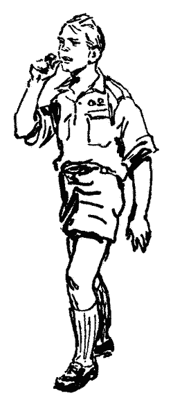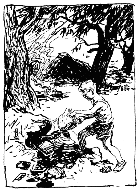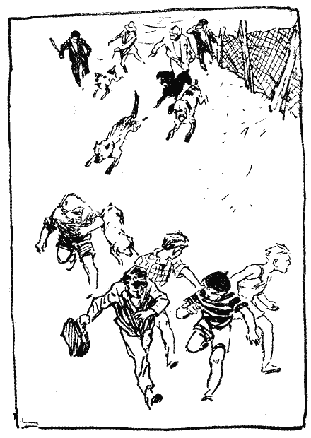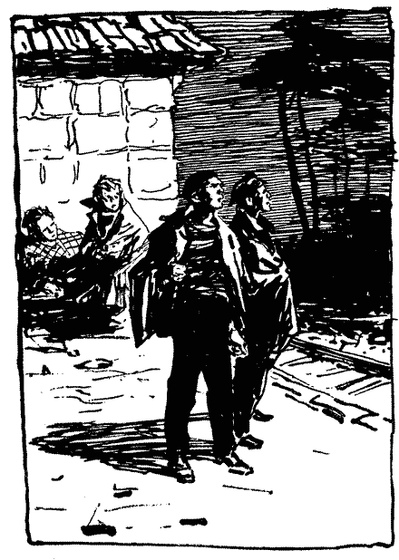 Він відповз назад, озирнувся, побачив, що хлопці виглядають з-за рогу, і погрозив їм кулаком.