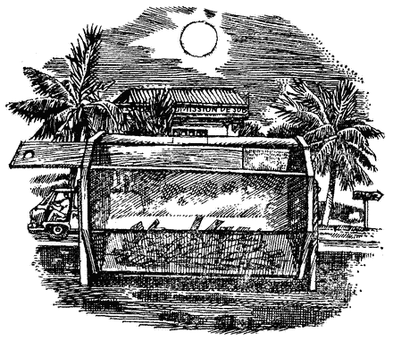 Обхід озера забрав ще з годину. Поки лазили, видиралися, виявили із західного боку, ще два струмки, які впадали в озеро. — Хіба воно бездонне? — здивувався Янг. — У нього он скільки ллється, а з нього — ні струмочка. — Висихає… — сказав Амара, але відразу ж додав: — Ні, не може стільки висохнути. Куди ж дівається вода? Он, по камінню можна побачити — не змінюється рівень. — Воно хоч і в колишньому кратері, але набагато вище від рівня океану. Якби прорвалася вода через ці скелі — от шугонуло б! — А може… А коли воно під землею тече в океан? Може бути таке? — Може. Вулкан, землетрус чого хочеш можуть наробити. Але якби вода провалювалася, то вона б кружляла, вир був би. От дурні, треба було краще приглядатися до поверхні. Янг зійшов по камінню до самої води, нарвав листя, шпурнув на воду. Листя розлетілося, впало, може, за якихось два метри від берега. Упало і лежить собі спокійно, нікуди його не несе, не крутить. — Вдруге не будемо обходити! — зітхнув Амара. — Нам треба ще південний схил гори розвідати — до самого моря. Якщо і тут нічого не знайдемо… — Амара не договорив, розпачливо махнув рукою. Південний схил здався не таким довгим, і був він набагато крутіший, ніж східний, який вів до міста. Нагромадження скель, тріснутих і розірваних напливів лави було більш дике і малодоступне. Тут дерев і кущів було менше, та й ті надто вже покручені й зігнуті. Ніде не помітили навіть маленької, хоч трохи рівної латочки, щоб можна було зачепитись, наносити туди землі й розбити хоч невеличкий город. Скелі закінчилися раптово обривом, далі внизу простягався піщаний берег, до білого прибою було метрів сімдесят. Подекуди на піску було розкидане поодиноке каміння і скелі, росли колючі кущі-молочаї, стирчали волоті султанської трави, сиділи кактуси. Чималий клапоть піщаного пляжу коло води був відгороджений щільним парканом, поверху якого було насновано три ряди колючого дроту. Згори хлопцям було видно, що діється за огорожею: зі східного боку площадки стояли два намети, підіткнуті з боків, щоб продувало вітром. Із західного долинало густе й часте чахкання. Там стояв на чотирьох колесах двигун, трохи схожий на той, що бачив Янг на понтоні в лагуні їхнього Біргусу. Посередині, ближче до паркану і до хлопців, підіймався автомобільний причіпний вагончик з високими й низькими антенами нагорі. Майже по прямій лінії за ним близько біля води лежали якісь ящики й смугасті бочки з паливом, а вже зовсім на воді при березі видно було катер чи глісер. Довго стежили хлопці, поки дочекалися хоч якогось руху за парканом. З одного намету вийшов робітник, попрямував до двигуна. Постояв там, постежив за приладами і знову вернувся у намет. Тільки добре придивившись, хлопці помітили, що від двигуна до вагончика з антенами і від нього до берега нібито повзуть чи шланги, чи проводи-кабелі. І ще одне вразило: на морі гойдалися розкинуті великим півколом гігантські поплавки — біло-червоні смугасті бочки. Вони були з'єднані рамами попарно, і з середини кожної пари стирчав угору стержень з вивіскою. Що було написано на тих вивісках, можна було прочитати хіба що тільки, в бінокль. Хлопці зійшли вниз, насторожено пішли повз паркан. Із східного боку, де Кампонг, виявили на паркані бляшану вивіску з написом. Текст був охоплений справа і зліва червоними знаками оклику — один крапкою вгору, другий 