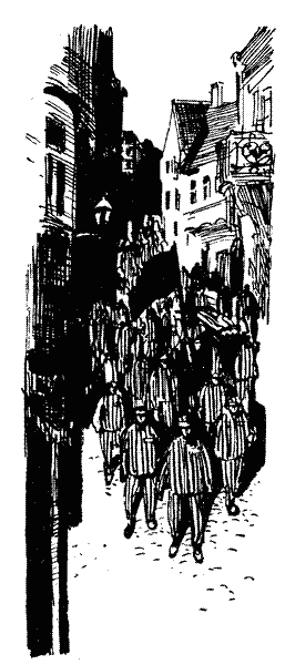 они йшли принишклими вулицями Мюнхена — п'ятнадцять тисяч в'язнів Дахау, мовчазні і грізні, неначе судді. Над їх непокритими головами палахкотіло червоне знамено. Зупинявся на вулицях транспорт, клякли на панелях перехожі, тулилися до вікон перелякані обивателі, і все навкруги нітилось і завмирало перед могутньою силою людей, одягнених в смугасті арештантські роби. Ритмічний гуркіт тридцяти тисяч колодок котився важкими хвилями по Бауерштрасе на Маріенплац і Тал. Однак ще швидше за ті хвилі бігла попереду чутка — вони ідуть! Мюнхен чекав на них уже другу добу. П'ятнадцять тисяч німців, поляків, французів, росіян, українців поверталися із гір Швабської Юри — гестапівці не встигли розстріляти їх на марші.
