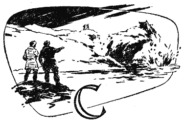 Амфибия садилась прямо на горное озеро, грудью чайки разбивая блики лунной дорожки. Луна стояла над самыми зубцами гор, и, словно целясь в нее, поднялось над контуром гор острие гигантской башни — ракеты… Часы показывали снова 9 часов 49 минут.