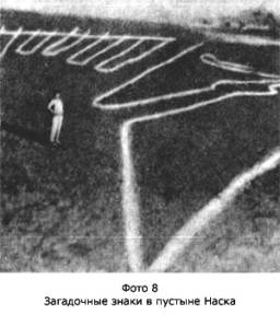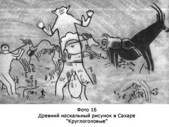 Древнейшие художники принадлежали к племенам, тысячелетия назад населявшим тогда цветущую и обильную Сахару. Анри Лот обнаружил, что рисунки наслаиваются «по эпохам». Более поздние нарисованы на месте самых древних. И вот эти-то, самые древние, представляют особый интерес. Профессор Анри Лот относит их к шестому — восьмому тысячелетию до нашей эры. Он объединяет рисунки того времени общим названием «периода круглоголовых». Почему «круглоголовых»? Да потому, что двуногие, прямостоящие существа на этих рисунках, напоминающие людей, изображены все… в круглых шлемах!.. Особенно поражает гигантский наскальный рисунок размером в шесть метров. — Когда я показал этот рисунок известному полярному летчику штурману Аккуратову, — вспомнил наш рассказчик, — он воскликнул: «Ведь это так походит на мой скафандр, который на меня напяливают перед высотным полетом! И шлем совсем такой же…» Да, похоже, что это скафандр! Профессор Анри Лот назвал этот рисунок «Великим богом марсиан из Джаббарена». Ущелье Джаббарена, где найден этот рисунок, в переводе с языка туарегов означает «Ущелье исполинов». Лот говорит, что упоминает марсиан условно, но именно такими мы представили бы сейчас марсиан или других космических пришельцев. Впоследствии, когда мне привелось встретиться с первым космонавтом Земли Юрием Гагариным, я вспомнил рассказ аспиранта. Гагарин надписывал свои бесчисленные фотографии. Я сказал ему: — Юрий Алексеевич! Вы немало надписали фотографий. Но посмотрите на рисунок, который сделан за восемь тысяч лет до вашего полета. Похоже? — Не вполне, но… похоже! — сказал Гагарин и надписал фотографию изображения своего инопланетного предшественника (фото 15). Да, похоже! Но что это на самом деле? Какая фантазия древнего художника могла породить это странное изображение? В корабельном салоне оказался профессор-философ, молча и скептически слушавший аспиранта. Он сказал: — Марксизм учит, что фантазия отталкивается только от опыта. Художник не мог выдумать ничего, что не видел хотя бы по частям, например, у сказочного дракона пасть крокодила, крылья летучей мыши и тело змеи… — Полноте, братцы, — снова вмешался капитан. — Просто обрядовое одеяние жреца, и все тут! — Одеяние тоже надо придумать. Этим оно принципиально не отличается от рисунка, оно требует такой же фантазии, отталкивающейся от действительности, — заметил профессор. — Всмотримся в рисунок, — предложил аспирант. — Штурман Аккуратов обратил мое внимание на крепление шлема. Оно говорит о том, что давление внутри шлема и снаружи было разное. Ниже два отверстия. Так изобразил старательный художник, очевидно, отверстия для глаз, передав в перспективе толщину шлема. Еще ниже — горизонтальные складки герметического воротника. И дальше — вертикальные складки свободно спадающей, очевидно, непроницаемой одежды. Но самое интересное, пожалуй, то, что это вовсе не единственное изображение, их множество (фото 16 и 17)! Аспирант показал нам их, листая книгу Анри Лота «Фрески Тассили». На последней фотографии нас поразило, что над шлемами одетых в скафандры существ видны какие-то решетчатые сооружения, которые напоминают… направленные антенны!.. — Вот вам свидетельство, пришедшее к нам через тысячелетия. Мы можем рассматривать портреты неведомых существ, спорить, строить догадки, но никак не 