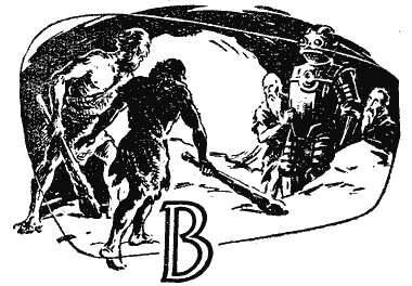 В багровых зарослях шел дождь. Косые струи гнули деревья, отламывали ветви. Болото бурлило и вздувалось. Сверкали звездоподобные молнии. Гром прокатывался волнами, как косо набегающий на берег морской прибой, усиленный в сотню раз. Не обращая внимания на ливень, по лесу, крадучись, пробирались двое. Их мокрые косматые плечи переходили в могучую шею, слипшиеся волосы скрывали крутой лоб с выпуклыми надбровными дугами. Маленькие и острые глазки настороженно смотрели из-под лохматых бровей с густо заросшего лица. Длинные бугристые руки раздвигали колючие лианы, не боясь шипов. С волосатых плеч спускались чешуйчатые шкуры, скорее напоминающие панцири, чем одежду. У каждого было по огромной узловатой дубине. Ящерицы с недоразвитыми крыльями бросались врассыпную при их появлении. Но мелкие твари не интересовали охотников, уже видевших желанную добычу. Большой ящер на выгнутых суставами наружу лапах, с пилообразным хребтом, переходящим в хвост с бивнем на конце, нежился в дождевых струях, довольно пофыркивал и прикрывал глаза пленками. Перед ним лежала мокрая груда объедков, среди которых еще трепыхалась пара раненых ящериц. Сытый ящер равнодушно наблюдал, как одна из них, опираясь на хвост, заковыляла по луже на задних лапах и скрылась за сетью лиан. Он не преследовал ее… Охотники набросились на ящера с разных сторон. Две дубины почти одновременно опустились на глаза чудовища. Взметнув фонтан воды, ослепший ящер повернулся. Его хвост наугад ударил острым бивнем невидимого врага. Бивень с размаху вонзился в топкую почву. Охотники ждали этого и бросились к завязшему концу хвоста, накинули на него петлю из лиан. Взбешенный ящер неистовствовал. Он не мог вырвать хвост и не видел врагов. Один из них бросил в разверстую зубастую пасть моток колючих лиан. Зверь в ярости проглотил моток и стал бросаться из стороны в сторону. От боли, страха и бешенства ящер взвивался на привязанном хвосте, огромное его тело отделялось от болота, и все четыре когтистые лапы рассекали воздух. Все тот же охотник, с ловкостью тореадора увертываясь от ударов, стоял прямо перед щелкающей зловонной пастью, выбирая момент. Другой спокойно наблюдал в стороне, готовый заменить товарища при неудаче. Ящер плюхнулся брюхом в воду. Голова его с бугром на темени оказалась как раз напротив охотника. Тот взмахнул дубиной и, крякнув, опустил ее на бугор. Ящер повалился на бок, как падает на бойне оглушенный бык. Ящер был еще жив, шея его то вздувалась, то спадала, но охотники, подойдя к нему вплотную, засунули дубины в щели между пластинами, прикрывавшими шею, и отодрали их. Под пластиной дрожала нежная мякоть. Охотники хорошо знали, где проходит важная артерия. Через минуту огромный ящер был мертв. — Мы могли бы убивать даже летающих, — гордо сказал один из охотников. — Ты опять о топорах из звонкой шкуры Чуда? — Для этого надо опустить дубины на головы стариков. — Они скоро умрут сами. — Умирают только охотники. Старики не охотятся и все время живут. — Они мудрые. — Мы сильнее их. Я опущу дубину на их головы и получу звонкую шкуру Чуда. Нагруженные добычей охотники добрались до скал. Из пещеры шел дым. Отблески огня играли на каменном своде. Косматые охотники отнесли добычу в глубь пещеры. Иссохшая старуха подбрасывала корни в костер и монотонно говорила. Несколько грязных воло
