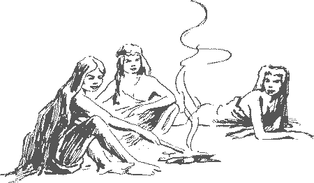 Трапилось це так. Довготелеса, зауваживши, що хлопчик Їжачок надто забруднився, і не маючи часу з ним панькатись, вийшла за курінь і гукнула рудих вовченят. Зраділі з такої до себе уваги, руді вовченята з дзявканням і голосним вереском кинулись за Довготелесою на точок, навколо якого стояли незграбні листяні курені людей з роду Рудих Вовків, і завозились з малечею. Серед вовченят, що їх покликала Довготелеса, бігала Волохата. Вона доводилась дочкою Одноокій Вовчиці, яку в таборі називали просто Сліпою. У Сліпої, ще як лежав сніг, народилося шестеро гарненьких, золотого кольору вовченят, але тоді ж цю щасливу матір спіткало велике лихо в особі страшного смугастого тигра. Із шести золотеньких вовченят він з’їв п’ятеро; з’їв би й шосте, коли б на нього не натрапили Голомозий і товстий Кендюх. Вони вбили звірюку. Відтоді Волохата лишилась у своєї мами одиначкою, кучерявою, вгодованою, веселою і спритною. Вона була більша, краща за всіх своїх подруг, які вже мало не з другого тижня мусили роздобувати самі собі харч, бо було їх у кожної вовчиці по чотири, по п’ять, тимчасом як Волохата, одиначка, могла досхочу їсти молоко у своєї одноокої матері. На точку Волохата перша підскочила до Їжачка, лизнула його теплим язичком у рот, у ніс, перекинула, залоскотала лапками його туге, ребристе, геть забруднене тільце. Їжачок, хоч і мав лише два роки, однак теж був хвацький хлопчина. Він, скільки мав сили, вп’явся Волохатій у вуха, аж вона заскімлила. Але тим часом підбігли інші вовченята і за одну хвилину з брудного хлоп’яти зробили рожевенького білоголового чистунчика, так ніби він пройшов п’ять купелей підряд. Забачивши на точку вовченят, до них кинулась геть уся дітвора табору, і швидко дзвінкий сміх і веселі вигуки заповнили геть увесь точок. Весела метушня долетіла і в кущі, де лежала Одноока Вовчиця. Вона нездужала після нещасливої зустрічі з диким кабаном. Добре, що лютий звірюка встиг лише розпороти їй півбока і ніскілечки не зачепив живота. Однак і після цього вона одлежувалася вже п’ятий день. Тож до її хвороби приєднався ще й сильний голод. А тут ще вереск у таборі. Чи не пощастило двоногим десь на вловах? Сліпа підвелася і сяк-так потяглась до куренів. Іноді в щасливі для мисливців хвилини їй перепадала не тільки якась необгризена кістка, а навіть цілі клапті смачних, іще теплих тельбухів. Доручивши Їжачка вовченятам, Довготелеса повернулась назад до вогнища і взялася доминати козячу шкуру. Люди з роду Рудих Вовків загалом майже круглий рік ходили голі. На дощі, негоду, сильні вітри взимку вони мало звертали уваги, спали залюбки на голісінькій землі, лише підклавши під себе шкури. Часом усе тіло бралося памороззю, білі ставали голови й бороди, а вони спокійно хропли собі. Але в Рудих Вовків була малеча: малечі ж, доки вона загартується, треба вкриватися теплим. Потім Руді Вовки страшенно любили прикрашати своє тіло. Ось на такі потреби і йшли шкури вбитих звірів. В особливій пошані у чоловіків були лев’ячі і тигрові шкури, а надто хвости й пазури. Жінки задовольнялись меншим — прикрашалися шкурами здебільшого мирних тварин — кіз, оленів, зайців. Але, щоб як слід виготувати цю окрасу чи зробити доладно торбину для дитини, шкуру треба було як слід вичинити. Чинбарів же в цих людей ще не було, і вони самі розминали шкури з допомогою лише своїх зубі