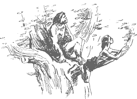Ну, хто повірить, що Голомозого нема в таборі, коли Довготелеса виразно й голосно, — її чути далеко навколо, і вже напевно її слова долетять до якогось гурту оленів, — гукає на дітвору: — Забирайтеся геть звідси. Тут спить дід Голомозий. Тихіше, не здіймайте галасу. Вогняна Хмаро, чуєш? Подай сюди оту шкуру! Ні, не ведмежу. Лев’ячу. Подай сюди лев’ячу шкуру… Поки Довготелеса оберігає спокій Голомозого й веде розмову з Вогняною Хмарою, Печеричка, Ґава, Синиця термосять Кендюха. Він, як завжди, куняє, і ці жваві молодиці, ніяк не знайдуть способу якось його розбуркати. — Кендюше, Кендюше! Щось велике, волохате суне до табору з лісу. — Ой, Кендюше, воно на двох лапах, отакенні плечі, ну ж бо, глянь! Ніс великий, як дві краплі схоже на тебе! Кендюх сопе й бубонить, а далі прискає і чмихає. Синиця заливається і кидається навтіки. Ну, кому ж не ясно, що вона підставила спичку і, клюнувши своїм звичаєм, Кендюх настромив на неї свій ніс. Отже ж, гуляйте собі, олені, в лісі, пасіться. В таборі і навколо нього все гаразд. Ніхто звідси нікуди не виходив. Голомозий, Кендюх, Вогняна Хмара й Око спочивають. Інші оберігають їх сон.