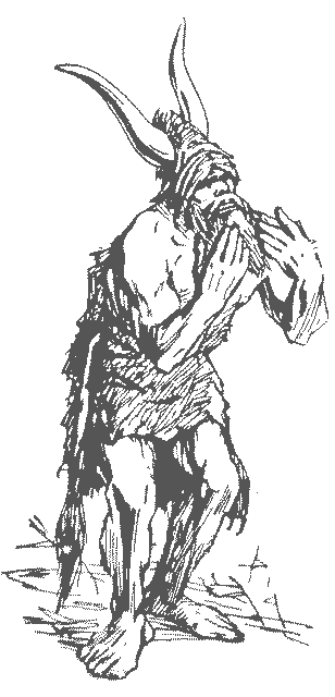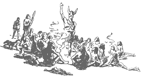 Голова Голомозого увінчана була, крім того, парою турячих рогів, які попереджали всіх і все, що чіпати людей з роду Рудих Вовків так само небезпечно, як і ставати на єдиноборство з туром. Око не мав на голові ніяких прикрас, зате обличчя його було страхітливо розмальоване. Дві широкі смуги навколо очей робили його схожим на окату сову: Око мав усе знати, тобто все бачити, і для цього йому потрібні великі очі. Що ближче підходили ці люди до вогнища, то сильніше й сильніше крутили свої чародійні кістяні цурки, аж поки зрештою фурчання від них не злилося в один скажений свист і рев. Разом з цурками метлялися від сильних порухів лев’ячі хвости, пантерячі шкури і цокотіло намисто із зубів хижаків. Все це тонуло у багряних відсвітах вогнища, і видовище здавалося справді грізним. Але це був тільки початок. Наблизившись до вогнища, Голомозий задержав свою цурку; це ж зробила й решта. Тоді наперед вийшов Око і, вийнявши гостро відточений крем’яний ніж, підійшов до осики, що стояла в центрі розкладених вогнищ. Це була величезна, на три людські обхвати, деревина з чудесною, рівною, начищеною вітрами, дощами і снігом корою. При світлі вогнищ кора здавалася ще чистішою, а її соковита гладизна ще свіжішою. До Ока швидко підійшов товстий, зовні незграбний Кендюх, удвоє ширший у плечах за звичайних людей. Його прикрашала тільки вузенька смужка із хутра і два зуби Великого Кота — махайродуса, найстрашнішого хижака тигрячої породи, який будь-коли існував на землі. Обоє — Око і Кендюх — обстежили кору на осиці і обережними прорізами накреслили високий, у людський зріст, прямокутник. Зробивши це, вони взялися вирізати окреслений шмат кори; вирізали його вони, проте, лише з трьох боків — зверху, збоку і знизу, так що по закінченні роботи кора мала відхилятись, як двері. Навколо стало зовсім тихо. Тимчасом Око повними глибокої таємності рухами вийняв із торбинки, яка висіла в нього при боці, кілька шматків кольорової глини — червоної, жовтої, чорної — і поклав усе це на товстий шкіряний щиток, який уже тримав у руках Кендюх. Всі завмерли в німому напруженні. Тоді Голомозий, узявши палицю, вдарив легенько у порожню липову колоду, і слідом за ним у такі ж колоди почали бити ще троє людей. Ліс та й уся Оленяча Долина наповнились гомінкими звуками, які дедалі дужчали, аж поки розкотилися звучними й тривожними переливами грому.