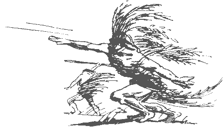 Оленячий Ріг мчить. Так спритно може бігти лише молодий олень. Цікаво, де оте одоробло, Кендюх? От попопріє, от посопе! Не зупиняючи бігу, Оленячий Ріг прислухається, але ніде не чути нічого. Ну, ясно ж, Кендюх ще, мабуть, не вибрався навіть з долинки. Теж зібрався бігти, теж має принести чудову звістку мисливцям! Однак, як ще далеко до табору! Справді далеко. Еластичне туге тіло Оленячого Рога вже вкривається потом, волосся прилипло до лоба. Та це нічого. Це тільки примушує хлопця налягати на ноги. От тільки що воно там зачорніло в кущах? Оленячий Ріг втягає носом повітря. Ведмідь. Однак, куди це він так поспішає? Ведмідь справді чапав, трусячись, назустріч Оленячому Рогові. Хлопець спритно шугнув за кущі, ведмідь також сахнувся, зиркнув у той бік, але, не затримуючись, знову побіг своєю дорогою. Чи не нагнали його Руді Вовки? От дурні!