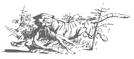 Але пантера, як і вовк, також усмак пообідала. Ступає вона нечутно й тихо. Все ж кози вже чують її і злякано ховаються за тура. З усіх звірів Оленячої Долини тур найбільше ненавидить цього хижака, що нападає зненацька з дерева. Однак він п’є, роблячи вигляд, що зовсім не помічає свого кривавого ворога і раптом робить скок. Летить на всі боки вода. Пантера, зненацька застукана, круто повертається. Вона вже майже вислизнула, однак враз злякано плигає назад, але й тур уже скільки сили тіка між кущі. На берег, примружуючи великі круглі очі від несподіваного сяйва з ріки, виходить шаблезубий тигр — Великий Кіт — махайродус. Це самиця. Перед нею біжать двоє її кошенят: Вайло і Непосидько. Поки Вайло обережно переставляє ноги, щоб не вступити в калюжу, Непосидько уже на двадцять кроків в обидва боки оббігає берег. Як багато тут пахощів! Все повітря переповнене ними. Однак, чому ніде нічого не видно? Тільки сліди, гарячі, вабливі, пахучі? Непосидько припадає носом до землі і захоплено звертає в кущі. — Куди? — грізно враз виривається клекотом із горлянки мами. — Назад! Звіря невдоволено зупиняється, палахкотючими оченятами дивиться на хащі, але згодом слухняно повертається до матері. Воно ще таке мале, головате, кривоноге, тулуб товстий. Для нього ще небезпечні самостійні мандрівки. Непосидько вже біля Вайла. — Та розтруси трошки свої ліньки. Ну, ось. Так! Так! Непосидько розкриває пащу, ловить Вайла за в’язи. Але бач, — хоч він і Вайло, а диви, як спритно звівсь на лапки, обхопив Непосидька за плечі, та й покотились разом під ноги мамі. Вона байдуже переступає через рудий багатоногий клубок і йде до води. Їй — спокій і воля. Ніде ні шелесне, ні писне. Хіба що пролетить яка пташка або зашарудить піском полоз-вужак. Довго і з смаком Великий Кіт злизує воду, бо куди йому поспішати? Вже, напевне, не сполохає його ніякий звір і, напевне, ніхто не відважиться порушити його спокій своєю невчасною появою. Напившись, звір виходить на сухе і лягає, витягши вперед лапи. Так приємно полежати, відпочити. Лапи напружуються, і, граючись ними, Великий Кіт випускає пазури і, так само граючись, всаджує їх у м’який ґрунт. Пазури гостріші за найкраще зроблений крем’яний ніж. Однак на лівій нозі їх тільки чотири. Про п’ятий краще не згадувати. Проте це і не таємниця. П’ятий пазур на лівій нозі Великий Кіт втратив у бою з носорогом. О! Згадай тільки за цю потвору, а вона вже й тут! Справді, з того берега заходить у воду носоріг. Він іде рівно, дивлячись просто перед собою. Величезна морда його на ходу припадає до води, ріг грізно підіймається просто до Великого Кота. Великий Кіт не голодний. Його не мучить спрага; він не знає страху. Його діти тут, при ньому. Однак присутність стороннього звіра, хоча б і на тому боці, йому не подобається. Кіт ховає пазури — всі дев’ять. Не підводячись, він б’є себе хвостом по боках, і з горлянки його виривається хрипкий, клекотливий крик невдоволення й перестороги. Може, тут і гнів за відчахнутий пазур. Носоріг підводить голову. Він не мастак бачити так далеко, проте голос звіра йому надто знайомий; він знає, що Великого Кота краще уникнути, ніж зустрічатися з ним віч-на-віч. І велетень злякано виходить на берег. Великий Кіт задоволено повертає голову і своїм широким шорстким язиком починає лизати малят. Одначе, що за знак? Що за тінь майнула там збоку? Різ