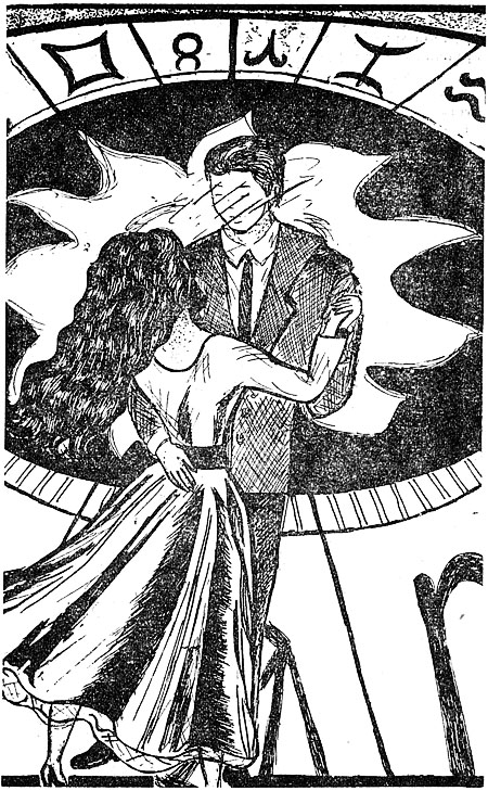 Девушка подняла глаза на своего партнера. Это был молодой мужчина, вероятно, привлекательной внешности, но черты его лица мешала рассмотреть какая-то дымка, стоявшая между ними. Наташа почувствовала какую-то необъяснимую тягу к своему кавалеру, казалось, что она его давно и хорошо знает. Молодой человек уверенно вел свою даму в танце. Вот они закружились в созвездии Весов — весело и беспечно стало на душе. Но вот в музыке появились какие-то тревожные, тяжелые звуки. Пара продолжала движение дальше и оказалась в зоне нового созвездия. Кавалер крепче прижал к себе девушку, нежно обнимая ее и что-то шепча, и в это время раздался громкий удар, от которого пол под ногами закачался. Мужчина поскользнулся, но благодаря ее поддержке устоял. Его руки сильнее и в то же время как-то мягко привлекли девушку к себе.