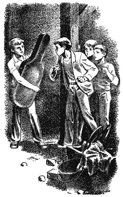 Щуплявий, маленький Владик став навшпиньки й зашепотів Льоньці у саме вухо: — Це новенький… Я бачу «гроб з музикою»! — Ну й очиська в тебе! Просто як у кішки! — чи то насмішкувато, чи то із заздрістю мовив Льонька і, відсторонившись від Владика, бридливо витер вухо рукавом курточки. В цю мить «новенький» якраз підійшов до членів БОБУПІШа. Високий Льонька зверху глянув на міцну, кремезну Олегову фігуру і «гроб з музикою», якого той все ще притискав до грудей. Здавалося, він прикривався чорним щитом від можливого нападу Льоні і його друзів. Вигляд у Льоньки й справді був дуже войовничий. Він став упівоберта, праве плече трохи вперед, а голову втягнув у плечі, мов боксер, готовий до бою. Худорляве обличчя його порожевіло, на щоках біля носа виступили крапельки поту, а задерикуваті очі виражали стан крайньої напруги, відчайдушного пошуку: чим би дошкулити «новенькому»? Олег спокійно, начебто нічого й не сталося, опустив свій чорний футляр, підійшов до дверей і почав не кваплячись відкручувати дріт. — Чому це репродуктор замовк? — суворим, командирським тоном запитав нарешті Льонька. — Зіпсувався, певно, — не обертаючись відповів Олег. — Ти бач, «зіпсувався»! Півгодини пограв і вже зіпсувався!.. Тиха Таня смикнула Льоньку за рукав: — Прийшов у гості — і розпоряджаєшся? — Хто прийшов у гості?! — пошепки спалахнув Льонька. — Я? Ми?! Це він приїхав до нас у гості з іншого будинку! Льонька хотів додати щось іще, але стрівся з твердим, спокійно-насмішкуватим поглядом Тані й замовк. На щастя, у цей час Олег зовсім розкрутив дріт, що заміняв замок. Тактовний і ввічливий Юхим запитав: — Можна зайти? — Можна! Заходь! — відповів Льонька, хоч Юхим звертався зовсім не до нього. Всі увійшли в недобудовану кімнату з балками замість підлоги, з темним горішнім дахом замість стелі і з голими цегляними стінами. На саморобному столі, схожому на довгастий дерев'яний верстак, височів радіопідсилювач. По його непоказному верхньому «одягу», що ледве прикривав складне хитросплетіння металевих нутрощів, можна було відразу сказати: підсилювач саморобний. Тут же стояв невеликий мікрофон, саморобний електропрогравач із платівкою на диску. Інші платівки лежали гіркою в картонній коробці. Химерно витягнувши свою тонку шийку, заглядав у вікно електропаяльник. Шматками застиглої лави валялася на столі каніфоль. Льонька, роззявивши рота, мов заворожений схилився над радіопідсилювачем. На нього дивилися сріблясті алюмінієві патрони конденсаторів, радіолампи; різнобарвні патрончики постійних опорів із хвостиками дротів; круглі, немов з-під вазеліну коробочки змінних опорів; великі котушки трансформаторів… Отямившись від першого враження, Льонька запитав: — Ну й що ж тут не в порядку? — А ти подивись… — відповів Олег. — Може, лампа барахлить. Чи трансформатор пробило… Льонька з виглядом знавця оглянув сяючі склом і сріблом нутрощі підсилювача і докірливо похитав головою: — Як це це ви без інструментів живете? Лише паяльник стирчить — і все… Тут без інструментів не обійдешся! На добродушному, круглому Олеговому обличчі не відбилося ані замішання, ані досади. — Інструменти? Будь ласка! — незворушно мовив він. Нахилився і поклав на верстак свій громіздкий чорний футляр. Попорпавшись у потаємній кишеньці штанів, він дістав маленький ключик і відімкнув крихітний вися
