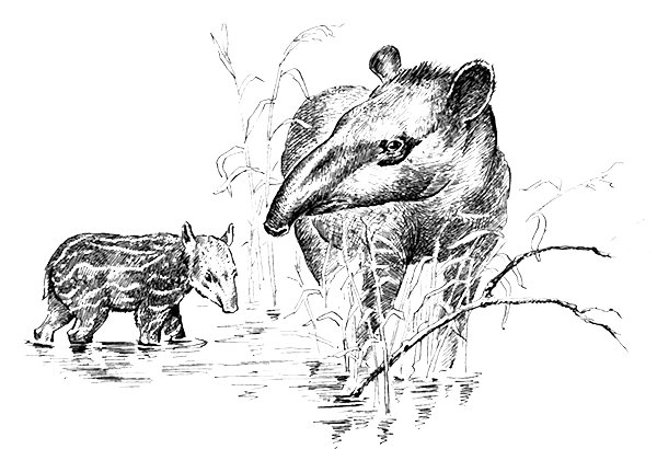 Тапиры — это крупные непарнокопытные, на передних ногах по четыре пальца, а на задних — по три. Голова узкая, оканчивается коротким хоботком; уши короткие и обычно стоят прямо. Тело покрыто короткой, но густой шерстью. Тапиры распространены в Южной и Центральной Америке, в Юго-Восточной Азии. Живут во влажных лесах, зарослях кустарников, очень подвижны, хорошо плавают и ныряют за водными растениями или спасаясь от врагов. Самки рождают обычно одного детеныша, который по окраске похож на поросенка дикого кабана. Численность тапиров невелика, и они нуждаются в охране.