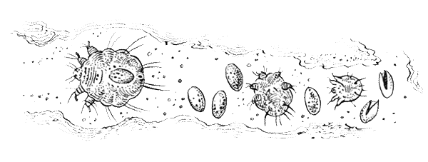 Клещевая чесотка — очень мучительная болезнь. Обычно клещи повреждают участки самой нежной кожи, т. е. кожу между пальцами, под мышками, в паху, в местах сгибов конечностей. Подобным заболеванием могут страдать и домашние животные, на которых паразитируют свои виды клещей: собачий, свиной, лошадиный и другие зудни.
