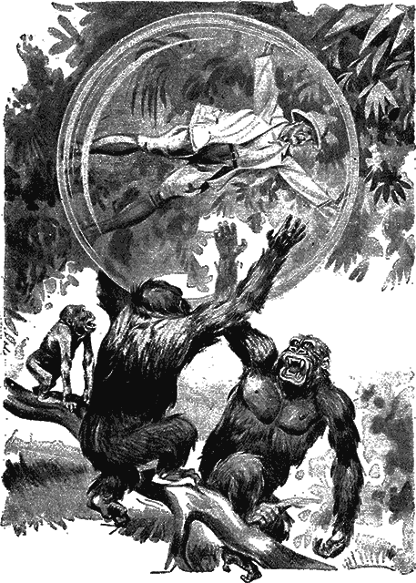 — И вам пришло в голову такое сравнение? — Разумеется. Итак, слушайте. Вам не приходилось читать, что в Америке изобретен особый металл, прозрачный как стекло, или стекло, крепкое как металл? Из этого материала построен, говорят, военный аэроплан. Удобство его вполне понятно: он почти не виден врагу. Говорю, почти, потому что летчик должен быть виден, так же как виден я сквозь мой шар. Так вот, я уже давно думал о том, чтобы устроить такую „крепость“, которая не мешала бы мне все видеть, наблюдать жизнь животных и защищала бы, если звери увидят и нападут на меня. Я проделал несколько опытов и достиг цели. Этот шар сделан из каучука. О, люди еще далеко не использовали всех качеств этого необычайно полезного материала. Именно каучук мне удалось сделать прозрачным как стекло и прочным как сталь. Несмотря на сегодняшнее не совсем приятное приключение, которое могло бы окончиться еще неприятнее, если бы вы не пришли во-время ко мне на помощь, я считаю свое изобретение очень удачным и целесообразным. А гориллы? Кто бы мог думать, что я встречу их здесь? Правда, это довольно дикое местечко, но гориллы обыкновенно живут в еще более диких, непроходимых дебрях. — Но как вы передвигаетесь? — Очень просто. Разве вы не видите? Я наступаю подошвой ноги на внутреннюю стенку шара и тяжестью своего тела заставляю его катиться вперед. На поверхности шара имеются отверстия для дыхания. Шар состоит из двух половинок, я вхожу в него и закрываюсь, стягивая особые ремни, сделанные из прозрачного каучука. Пожалуй некоторым неудобством является то, что на уклонах бывает трудно задержать шар, он начинает катиться быстро, и тогда приходится заниматься физкультурой. Но почему бы и не заняться?»