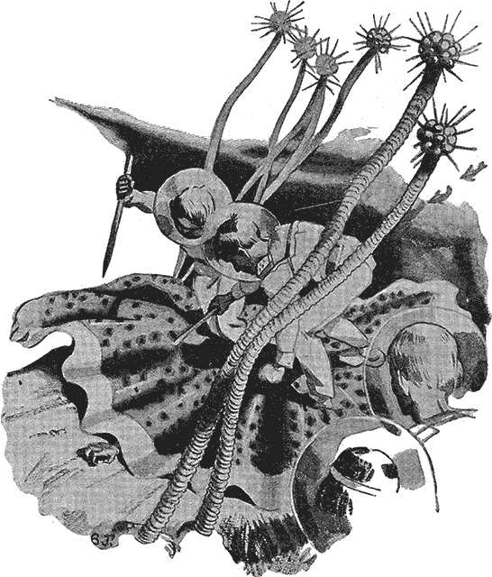 Сканлэн бросился вперед и, вспрыгнув на широкую спину чудовища, вонзил острый конец металлического копья в его мягкое тело…