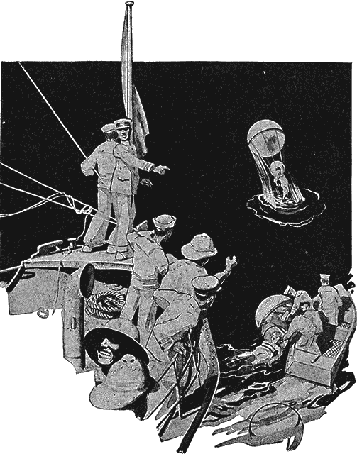 Было прекрасное утро. Темно-сапфировое море было спокойно, как озеро, и небосвод не омрачался ни единой тучей. Еще до восхода солнца вся команда «Марион» была на ногах и с живейшим интересом ожидала событий. Когда время стало приближаться к шести часам, общее волнение достигло апогея. На сигнальной мачте был помещен особый дозорный, и было без пяти шесть, когда мы услыхали его крик и увидели, что он указывает на что-то справа от корабля. Сквозь слой прозрачной воды я увидел нечто вроде серебристого пузыря, с большой скоростью поднимавшегося из глубины океана. Пузырь вырвался на поверхность, метрах в ста от яхты, и взлетел на воздух; он оказался красивым блестящим шаром около метра в диаметре; шар легко опустился на воду и медленно поплыл по ветру, покачиваясь, как детский воздушный шарик. Это было волшебное зрелище, но оно заронило тревогу в наши сердца. Под шаром болтался обрывок веревки. Тотчас же была послана следующая радиограмма: