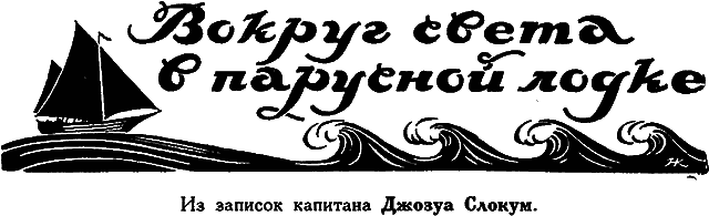 В первой половине записок Дж. Слокум, напечатанной в предыдущем номере нашего журнала, рассказывается, как отважный американский капитан, понуждаемый безработицей и пользуясь случайно подаренной ему старой парусной шлюпкой, пустился на ней в кругосветное плавание, продлившееся около трех лет. Слокум заново перестроил эту лодку, и один — сам «капитан и экипаж» — отплыл из Ферхавна (недалеко от Бостона, Сев. Америка). Свой первоначальный маршрут — мимо Азорск их островов, через Атлантический океан, Средиземное море и Суэцкий канал — дальше на восток — он решил изменить, уже добравшись до Гибралтара. Отсюда он вторично пересек Атлантический океан, миновав Острова Зеленого Мыса, направился к Южной Америке и вдоль восточных берегов ее добрался до Магелланова пролива, через который вышел, наконец, в Тихий океан, благополучно преодолев все трудности и опасности.