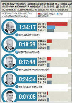ЛИГА ИЗБИРАТЕЛЕЙ по итогам первой агитационной недели отмечает серьезные нарушения в том, как федеральные телеканалы освещают деятельность кандидатов в президенты. Выпуски новостей федеральных телеканалов служат откровенным пиар-инструментом Владимира Путина. Под видом информирования о работе не ушедшего в отпуск председателя правительства идет неприкрытая пропаганда в пользу одного из кандидатов за счет налогоплательщиков. Сообщения о суточных отпусках премьера звучат издевательски — эти дни ничем не отличаются от обычных предвыборных будней. В. Путин как ньюсмейкер доминирует во всех информационных программах, федеральные телеканалы "отрабатывают" в эфире каждый его шаг и каждое слово, относясь к ним как к важнейшим информационным поводам. Вся исходящая от премьера информация подается как абсолютная истина: не предлагается сторонних экспертных оценок, не предоставляется слово оппонентам, тон телевизионных комментаторов неизменно благоговеен. Таким образом федеральные телеканалы фактически работают телеотделами штаба одного-единственного кандидата, внедряя в общественное сознание идею о том, что он является заведомым победителем, находящемся вне всякой конкуренции. Замена В.Путина на теледебатах его «представителями» оскорбляет не только прочих кандидатов, но и избирателей: получается, что многолетний глава государства и правительства не считает нужным в режиме публичной полемики отчитываться перед обществом за свою прежнюю деятельность и отстаивать свою предвыборную программу. Все эти нарушения ставят под еще большее сомнение честность нынешней избирательной кампании, которая в глазах общества и так сильно скомпрометирована недавними массовыми злоупотреблениями в ходе думских выборов, а также заведомо неравными условиями выдвижения и регистрации кандидатов в президенты. ЛИГА ИЗБИРАТЕЛЕЙ требует от руководства федеральных телеканалов в кратчайшие сроки устранить нарушения в эфирном представлении кандидатов, а от Центральной избирательной комиссии — проконтролировать исполнение этого законного требования. В противном случае миллионы людей сочтут президентскую кампанию — вслед за парламентской — нечестной, несвободной, несправедливой и в конечном итоге нелегитимной, что чревато для общества и государства серьезными потрясениями.