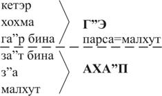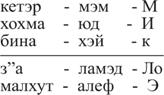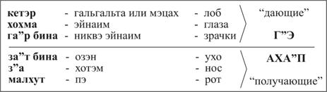 А”А – парцуф хохма, центральный, исходный парцуф мира Ацилут, от которого рождаются все остальные парцуфим. АБА – отец – парцуф хохма ИМА – мать – парцуф бина З”А – сын (относительно АВ”И) ЗО”Н – З”А и нуква-малхут НУКВА, МАЛХУТ – сфира или парцуф, получающий от всех предыдущих парцуфим. Малхут мира Ацилут – сумма всех творений, всех человеческих душ, от чего называется Кнэсэт Исраэль – собрание Израиля. Исраэль – свойство «отдавать», альтруизма, свойство Творца, свойство бины. Исраэль происходит от слов Исра – прямо, и Эль – Творец. Таким образом, Исраэль – это свойство-стремление (сближение свойствами) к Творцу. Народы мира – стремление к самонаслаждению. Естественно, в каждом человеке существуют эти два свойства, и Каббала является методикой развития свойства Исраэль с целью достижения Творца человеком еще в этой жизни. Сфирот «-» Имена Творца К ЭТЭР «-» ЭКЕ=алеф-хэй-юд-хэй ХОХМА «-» ЙЯ=юд-хэй БИНА «-» АВА”Я с некуд элоким ХЭСЭД «-» ЭЛЬ=алеф-ламэд ГВУРА «-» ЭЛОКИМ=алеф-ламэд-хэй-юд-хэй ТИФЭРЭТ «-» АВА”Я с некуд шва, холам, камац НЭЦАХ и ХОД «-» ЦВАОТ ЕСОД «-» ШАДАЙ=Шин-Далет-Юд или / ЭЛь=алеф-ламэд ХаЙ=хэт-юд МАЛХУТ «-» АДНИ=алеф-далет-нун-юд КЛИ – эгоистические желания и стремления, эгоизм не называются кли. Кли – это исправленные, годные для получения света, желания, т.е. уже неэгоистические, а с экраном, обращающим эгоизм в альтруизм. СОСУД – сердце человека, получающее все ощущения, называется сосудом получения ощущений. Духовный сосуд, только о таком и говорит «Зоар», – это желание отдать Творцу, протянуть Творцу все свое сердце, все свои желания, как бы говоря, что согласен всем сердцем, всеми своими желаниями отказаться от всего себя ради Него. Такое полное, истинное намерение и называется «ли шма» – «ради Творца». СМЯГЧЕНИЕ ограничения закона; ограничение – это запрет малхут получать свет. Устраняется вследствие получения ею исправления свойствами бины. ЗИВУГ – переводится как половое соитие мужской и женской особи в нашем мире. Поскольку духовные действия абсолютно оторваны от наших понятий, мною предпочтено оставить ивритское слово «зивуг» как более отвлеченно воспринимающееся не знающим иврит, а потому менее путающее своими ассоциациями. Духовный зивуг есть стремление высшего – з”а – мужской части передать свет-наслаждение низшему – малхут – женской части. Оба желания при этом совершенно бескорыстны, как в примере хозяина и гостя. ПБ”П – паним бэ паним, лицом к лицу. Когда Захар – мужская сфира, Аба – отец, передает ор хохма женской сфире Има – матери, для передачи детям – зо”н. Такие же отношения АБ”А, ПБ”П и пр. происходят и между их детьми – зо”н, з”а и малхут. АБ”А – спинами (произносится ах бэ ах). Если парцуф АБА-хохма имеет свет ор хохма, но не желает его передать парцуф ИМА-бина, а ИМА также не желает получить, то такое их отношение называется спина к спине. Такие же отношения могут быть и между з”а и малхут. ХЭСЭД – милосердие, сострадание, альтруизм, ОР ХАСАДИМ – свет милосердия, сострадания, альтруизма. Возникает, ощущается только в том кли-желании, которое желает бескорыстно «отдавать», быть подобным Творцу. Это свойство сфиры или парцуфа бина. Бина мира А”К называется СА”Г. Бина мира Ацилут называется Има, высшая мать, Ишсут, АВ”И и пр. Свет бина – это наслаждение от подобия, близости по свойствам с Тво