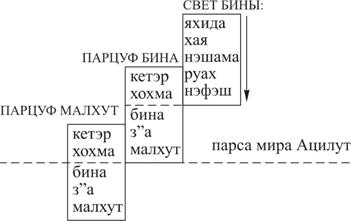Малхут ограничила распространение света в парцуфе, и образовались 2 части в парцуфе: Г”Э получает свет, сфирот кэтэр и хохма со светами нэфэш, руах, а другая часть парцуфа – под парса и поэтому не получает свет: сфирот бина, з”а и малхут. Также вне парцуфа находятся соответствующие им света – нэшама, хая, яхида.
