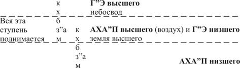 На чертеже (г”э) человека в нашем мире взяты в скобки, потому что у человека в нашем мире, т.е. духовно находящегося на ступени нашего мира, а не своим телом, нет желаний отдавать. Поэтому говорится, что человек, находящийся своими свойствами в нашем мире, в эгоизме, имеет только точку в сердце, от которой может начать свое духовное развитие. Также сфира есод мира Асия оканчивается на своем небосводе, и есть в нем также бина и зо”н сфиры ход мира Асия. А также сфира нэцах мира Асия удвоилась и т.д. вплоть до бина мира Ацилут. Поэтому пророк Элияу поднялся и соединился с бина и зо”н, упавшими с малхут мира Асия в этот мир. И сравнялся с ними и оделся в них, вследствие чего они стали как он, его ступень. На вышеприведенном чертеже не показаны все 10 сфирот мира Асия, но, как уже сказано, каждая ступень делится на свои г”э и аха”п. Задача человека состоит в отыскании внутри себя аха”п высшего и принятии его, соединения, слияния с ним всеми своими ощущениями и желаниями. Тогда воздействовало 12-буквенное имя (вследствие света А”Б-СА”Г), отчего малхут мира Асия спустилась с бина сфиры малхут мира Асия на свое место, малхут дэ малхут, место окончания 10 сфирот. И поднялись бина и зо”н на свою ступень, как прежде, выше небосвода малхут. А поскольку Элияу своими свойствами уже был слит с этим воздухом, т.е. с поднимающимися бина и зо”н, то поднялся вместе с ними и Элияу вверх, выше небосвода малхут, вследствие своего совпадения с ними.