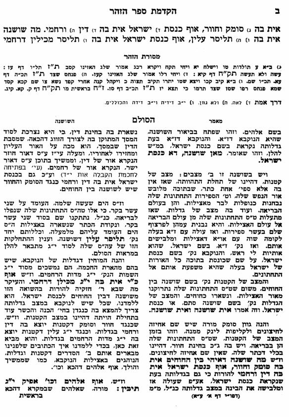 1. Раби Хизкия открыл, написано, как роза среди шипов. Что роза, это Собрание Израиля. Потому что есть роза и есть роза, что роза она между шипов, есть в ней красное и белое, так Собрание Израиля, есть в нем закон и милосердие. Что роза, есть в ней 13 лепестков, так Собрание Израиля, есть в нем 13 свойств милосердия, окружающих его со всех сторон. Но Элоким, что здесь, когда подумал вывести 13 слов окружить Собрание Израиля и стеречь его. 2. Затем упомянуто в другой раз, почему упомянуто в другой раз, чтобы вывести 5 лепестков крепких, окружающих розу. И эти 5 называются спасение. И эти 5 ворот. И об этой тайне написано, чашу спасения подниму, это чаша благословения. Чаша благословения должна быть на 5 пальцах и не более, как роза сидит на 5 лепестках сильных подобно 5 пальцам. И роза – это она чаша благословения, от Элоким два до Элоким три 5 слов. Отсюда и далее, свет создан и скрыт, соединен в союзе том и вошел в розу и вывел в неё семя. И это называется древо, дающее плод, которое посадили в нем. И это семя существует в букве союза действительно. 3. И как вид союза, посеянного в 42 зачатиях, от того семени, так посеяно имя законодательное особое творения. 4. Вначале. Раби Шимон открыл, ростки показались в земле, ростки – это действие творения. Показались в земле, когда, в день третий, сказано: «И произрастит земля», тогда показались в земле. Время пения пришло, это день четвертый, в который было укорачивание, от света хасадим. Голос горлицы, это день пятый, где написано: «Воскишит вода и пр.», произвести потомство. Слышно, это день шестой, где написано: «Встанем, сотворим человека», и сказано там: «Сделаем и услышим». В нашей стране, это день Субботний, что он подобен стране жизни. 5. Иное значение ростки эти – они отцы, вошедшие в мысли мира будущего, и скрыты там. Оттуда вышли в скрытии, скрылись в истинных пророках, родился Йосэф, и скрылись в нем, вошел Йосэф в страну святую и основал их там, тогда показались в стране (земле) и раскрылись там. Когда видимы. Когда раскрывается радуга в мире, это когда видна радуга, тогда раскрываются они. Ибо пришло время укорачивать. Пришло время искоренять грешников из мира. Почему спасаются. Потому что ростки видны в земле, а если не были бы видны, не остались бы в мире, и мир бы не смог существовать. 6. Кто оживляет мир и вызывает отцов раскрыться, голос детей, занимающихся Торой, т.е. эти дети мира мир спасают. Соответственно: «Золотые подвески сделаем тебе», это эти дети, дети мира, как сказано: «Сделай два Крува золотых». 7. Вначале. Раби Эльазар открыл: «Поднимите глаза ваши вверх и смотрите, кто создал это». Поднимите глаза ваши, в какое место. В место, где все глаза зависят от него, и кто он. Открывающий глаза. И там узнаете. Это скрытый Атик, где есть вопрос, создал это. А кто он, М”И = кто. Он называется от края неба высшего, где все принадлежит ему. Т.к. есть вопрос, он по пути скрытому и не раскрывается, называется М”И, потому что выше нет вопроса, этот край неба называется М”И. 8. И есть другой внизу и называется М”А, что между этим и этим, но первый скрыт, называемый М”И, есть в нем вопрос, потому что спрашивает человек, исследует и смотрит и познает от ступени к ступени до конца всех ступеней, после нахождения там М”А, что знает, что смотрит, что исследует, все скрыто, как вначале. 9. Об этой тайне написано: «На кого могу указать тебе, с кем сравнит