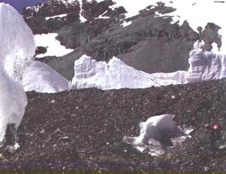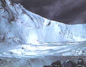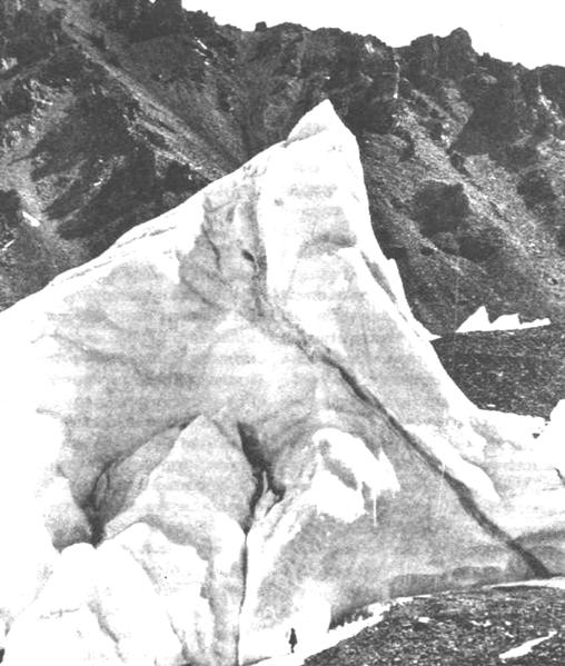 Эверест, возвышающийся в конце долины, сильно заснежен. Тепло, кое-где видна скудная зелень, вода еще не вся замерзла. Пирамида, воздвигнутая некогда в память о погибших в первых эверестских экспедициях, не сохранилась.