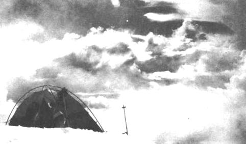 Моя палатка, которую я ставил вечером и снимал утром, имела самонесущую конструкцию. Она натягивалась на пересекающиеся алюминиевые штанги, образующие полусферу. Это палатка моей конструкции, сделанная специально для этого одиночного восхождения.